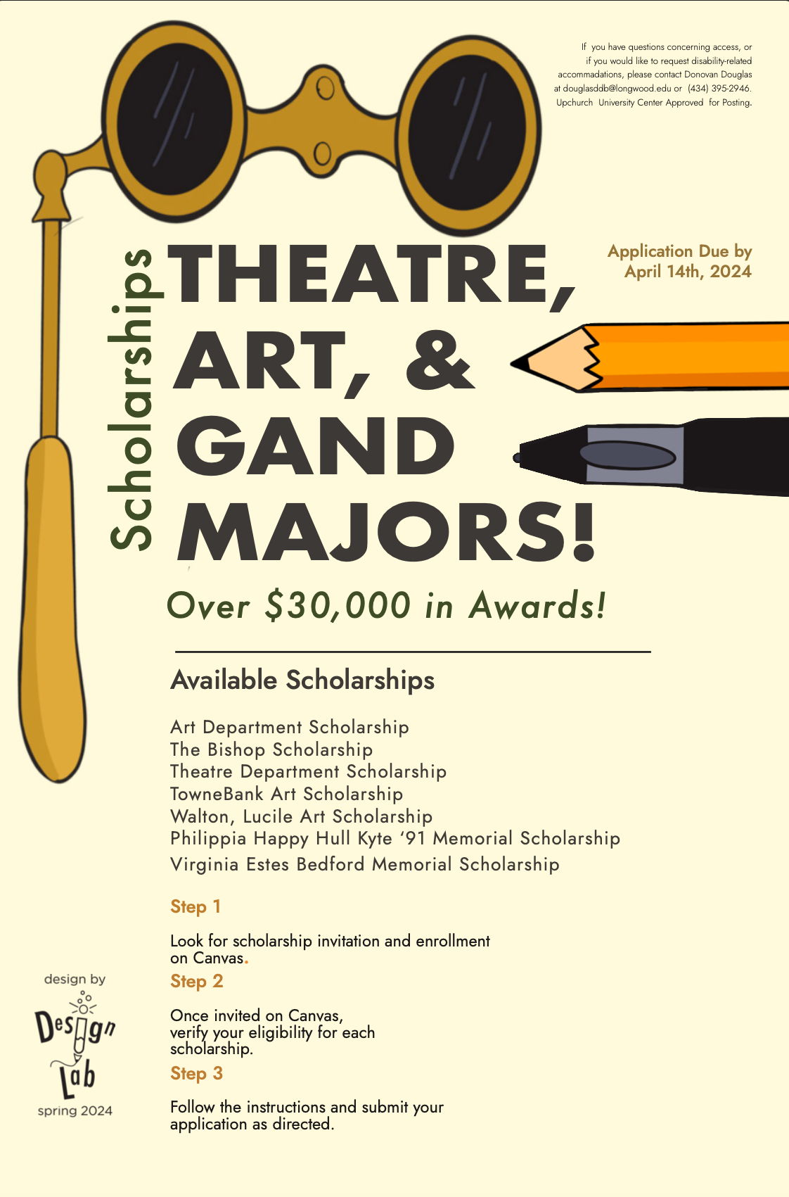 I created this poster as a Junior Designer in the Design Lab at Longwood University. This was to advertise scholarships available to students in the Theatre, Art, Graphic, and Animation Design majors.